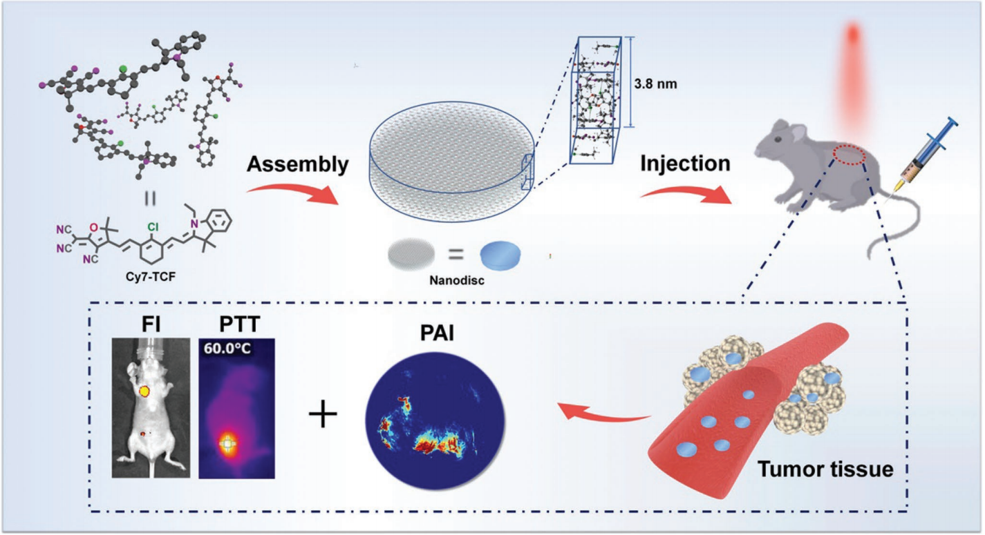 图1. Cy7-TCF自组装的2D纳米片及其在荧光成像和光声成像引导下的光热治疗示意图。