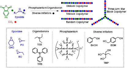 近期,该团队构筑了一种大体积磷腈盐四[三(二甲氨基)亚氨基]氯化磷P5Cl/TEB二元催化体系,通过环氧/酸酐/CO2的一锅/一步法三元共聚,实现了嵌段或者真正无规聚酯-聚碳酸酯共聚物的精准合成。通过调节P5Cl与TEB的摩尔比,可以一锅法制备序列结构可控的聚酯-聚碳酸酯共聚物,包括结构明确嵌段共聚物和无规共聚物。此外,作者还利用不同的醇引发剂合成了具有不同拓扑结构的共聚物,并通过改变环氧单体和酸酐的种类,制备了组成和结构多样化的CO2基聚合物材料,为该类材料的潜在应用提供了更多可能性(图1)。